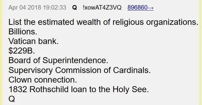 A referência de QAnon a “DINHEIRO, PODER, INFLUÊNCIA” aponta para um nexo de atores que enfatizam o controle do Vaticano. É aqui que outro post QAnon se torna útil para entender esse nexo de atores.