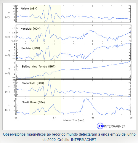 O campo magnético da Terra estava tão quieto em 23 de junho, que a onda foi ouvida em todo o mundo. A rede global INTERMAGNET de observatórios magnéticos captou a atividade de ondas ao mesmo tempo do Havaí à China e ao Círculo Polar Ártico. Há até uma dica disso na Antártica.