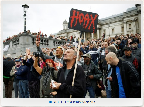 “Milhares se reúnem em Trafalgar Square para promover as teorias da conspiração contra o coronavírus em um protesto ‘anti-lockdown’.”Agora, embora houvesse alguns excêntricos indubitáveis na multidão – incluindo o orador principal David Icke, que acredita que os lagartos [reptilianos] controlam o mundo, e um homem na parte de trás desfraldando brevemente uma bandeira fascista – excluindo esses dois todos ali eram realmente teóricos da conspiração?