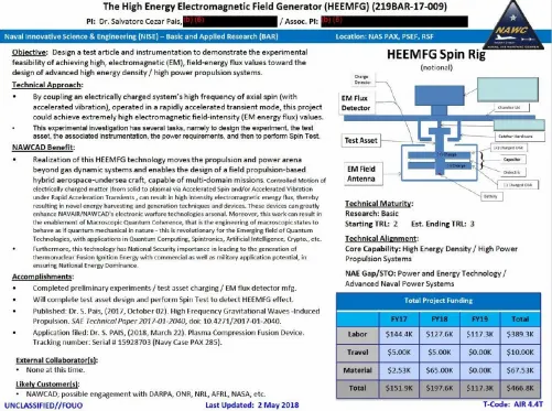 Além disso, os documentos contêm a proposta de Pesquisa Básica e Aplicada (BAR) que foi submetida para garantir financiamento e recursos para o teste do conceito de Gerador de Campo Eletromagnético de Alta Energia do Dr. Pais. Ao todo, parece que pelo menos $ 466.810 já foram dedicados ao projeto entre os anos fiscais de 2017 e 2019 – muito mais do que se pensava anteriormente.