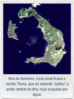 A baía em si é, na realidade, uma cratera formada pela antiga erupção, e é tão profunda que dizem que nenhuma âncora de navio é capaz de alcançar o fundo. Por volta de 1930, o arqueólogo grego, Spyridon Marinatos, foi o primeiro a dizer que, em algum momento no final da era Minoana, uma gigantesca erupção vulcânica havia assolado a ilha. Em 1956, dois geólogos, Dragoslav Ninkovich e Bruce Heezen, realizaram uma pesquisa do fundo do mar para tentar determinar, com precisão, qual tinha sido a magnitude da erupção. De seu barco de pesquisas, o Vema, foram capazes de apurar o exato tamanho da cratera vulcânica — trinta milhas quadradas — e com isso puderam estimar as incríveis proporções do evento. Há diversos tipos de erupções vulcânicas, algumas lançam rios de lava derretida, outras produzem desmoronamentos de lama quente, porém, a mais terrível e devastadora é aquela em que a pressão do magma faz com que o vulcão literalmente estoure seu pico.