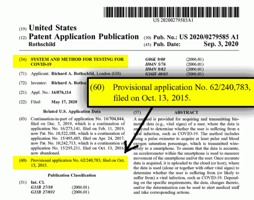 Em 2015, um homem chamado Richard A. Rothschild registrou uma patente para um ‘Sistema e Método para Testes para COVID-19’. (2D) Pode não ter tido o rótulo COVID-19 em 13 de outubro de 2015, mas o tem agora. O interessante sobre essa ‘invenção de kit para detecção de vírus’ é que o inventor não é uma pessoa com formação em medicina, mas é um advogado.